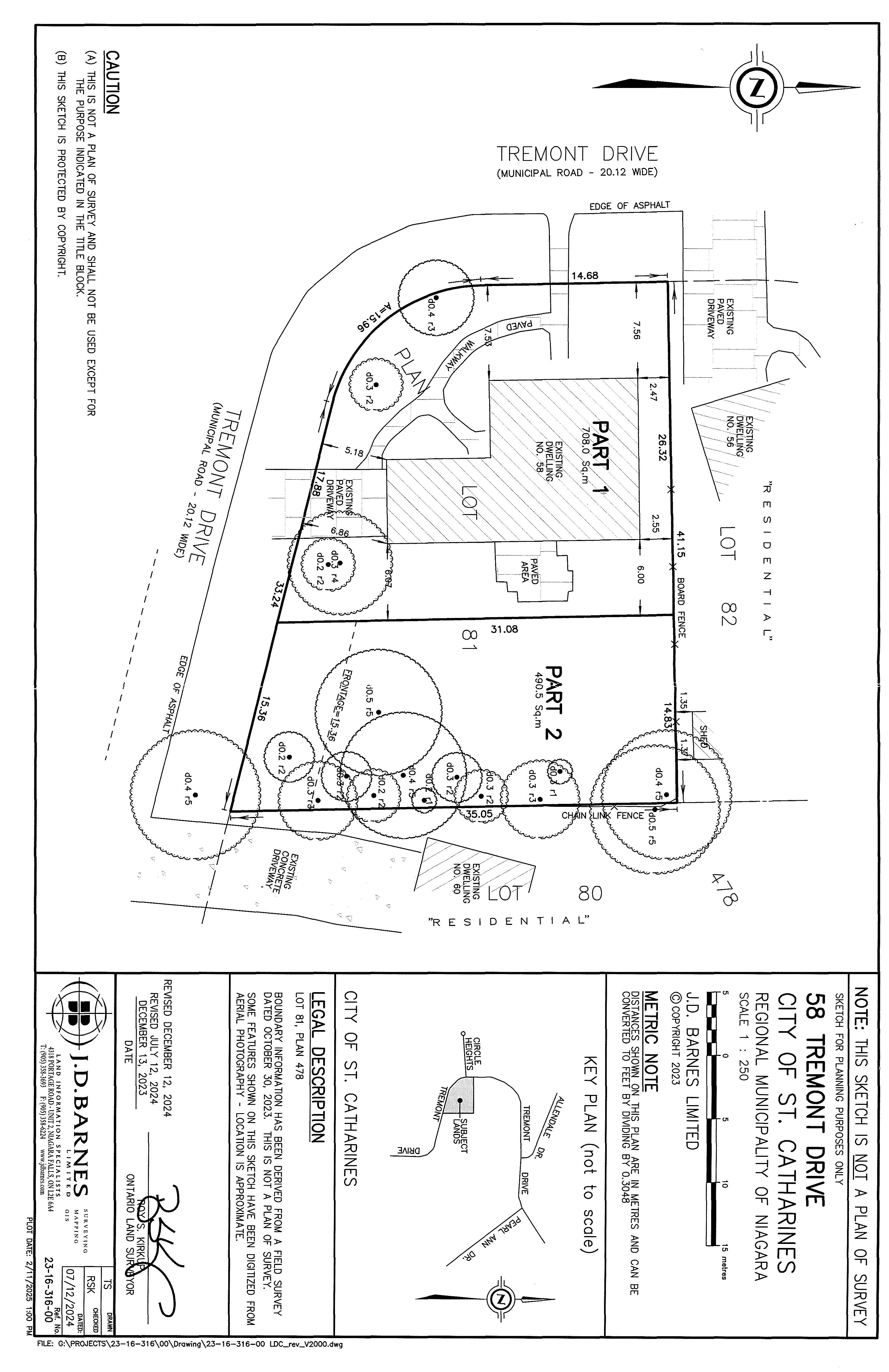 Application B-08/26SC is made for consent to sever 490.5 square metres (Part 2 on the submitted sketch) for a proposed detached dwelling, to be known as 58A Tremont Drive. A 708 square metre remnant parcel (Part 1) is to be retained with an existing detached dwelling.