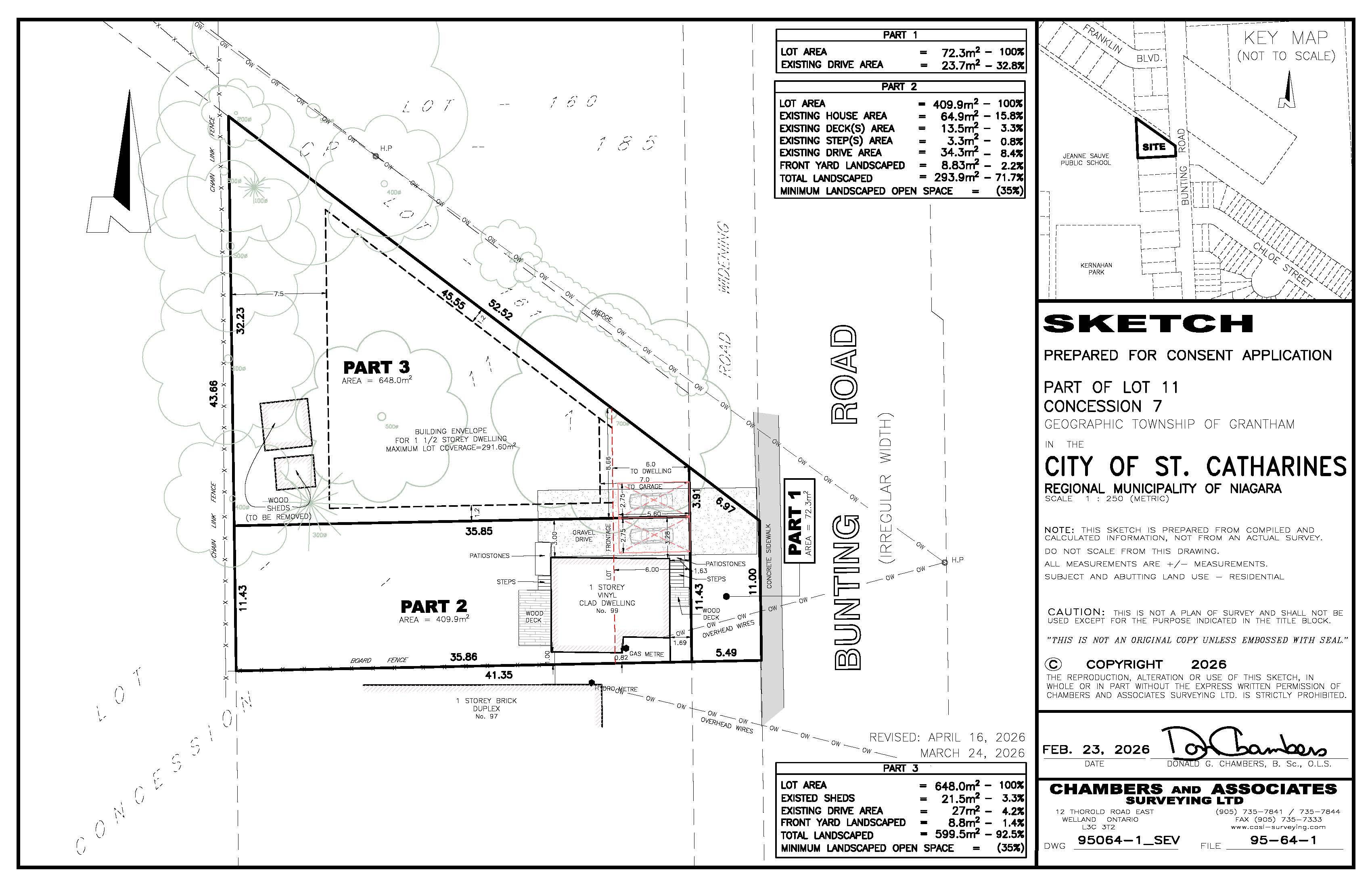 Application B-09/26SC is made for consent to sever 648 m2 (Part 3 on the submitted sketch) for the creation of a new residential lot to be known as 99A Bunting Road. The remnant parcel, Part 2 on the submitted sketch, will be retained for continued residential use. Part 1 on the submitted sketch is for a road widening to be dedicated to the City of St. Catharines. There are concurrent minor variance applications A-24/26 & A-25/26.